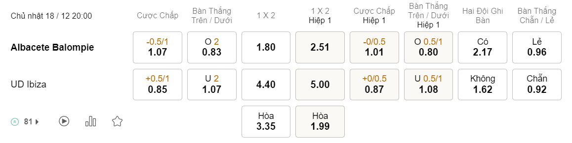 Soi kèo hiệp 1 Albacete vs Ibiza: 1.01*0/0.5*0.87