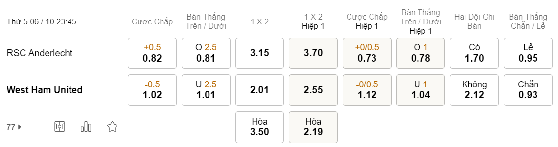 Soi kèo hiệp 1 Anderlecht vs West Ham: 0.73*0/0.5*1.12