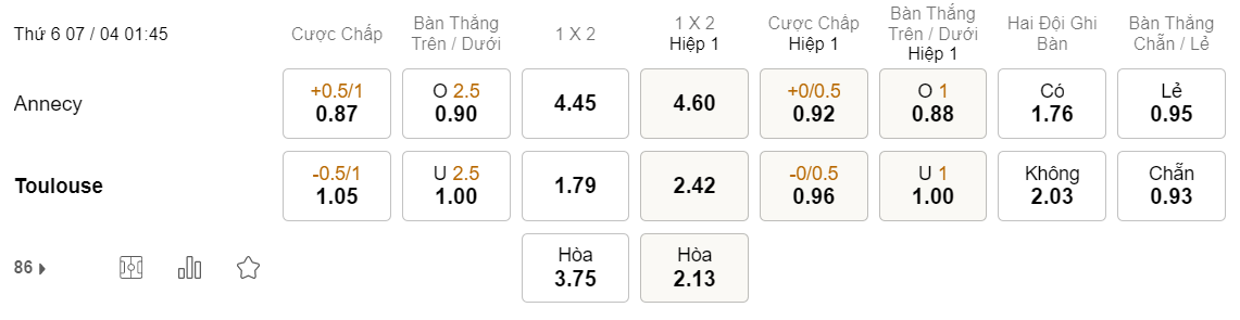 Tỉ lệ kèo Annecy vs Toulouse