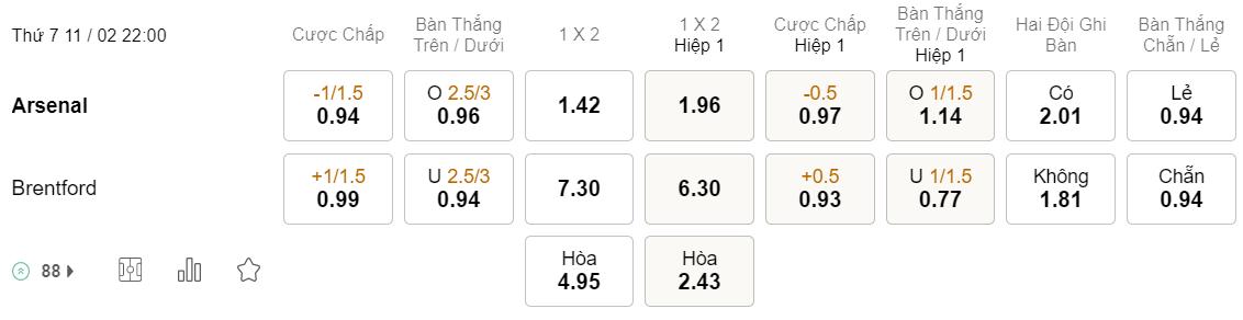 Soi kèo châu Á Arsenal vs Brentford: 0.94*1/1.5*0.99
