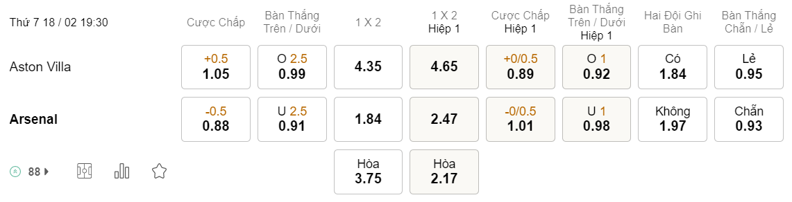 Soi kèo châu Á Aston Villa vs Arsenal: 1.05*0.5*0.88