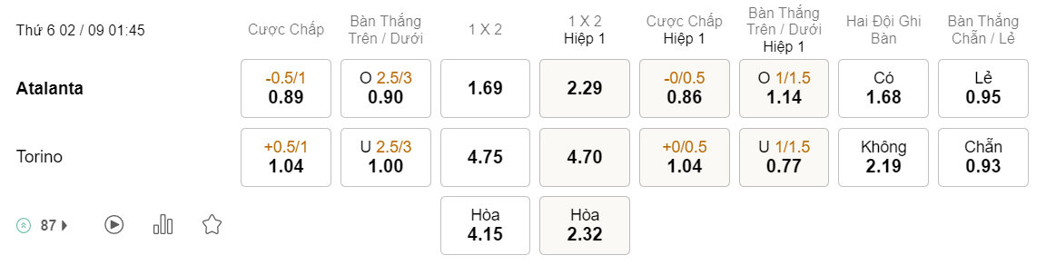 Soi kèo hiệp 1 Atalanta vs Torino: 0.86*0/0.5*1.04