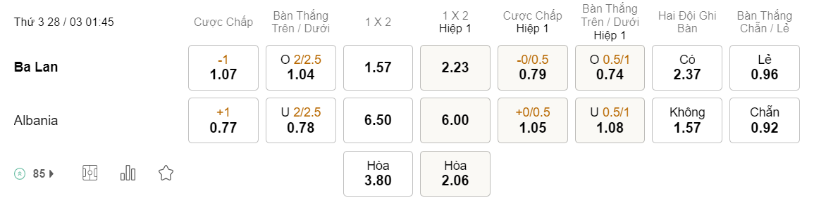Soi kèo châu Á Ba Lan vs Albania: 1.07*1*0.77