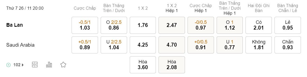 Soi kèo hiệp 1 Ba Lan vs Saudi Arabia: 0.97*0/0.5*0.91