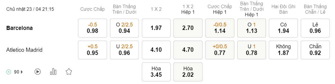 Tỉ lệ kèo Barcelona vs Atletico Madrid