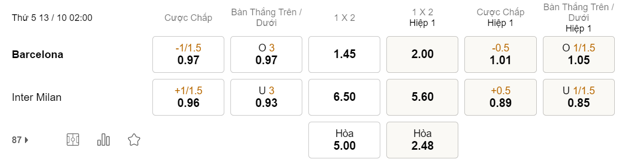 Tỉ lệ kèo Barcelona vs Inter