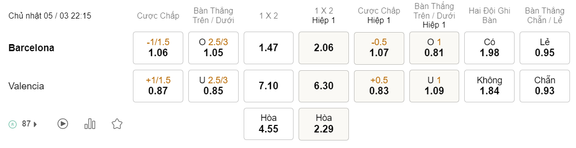 Soi kèo hiệp 1 Barcelona vs Valencia: 1.07*0.5*0.83