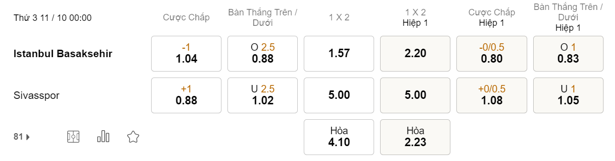 Soi kèo châu Á Basaksehir vs Sivasspor: 1.04*1*0.88