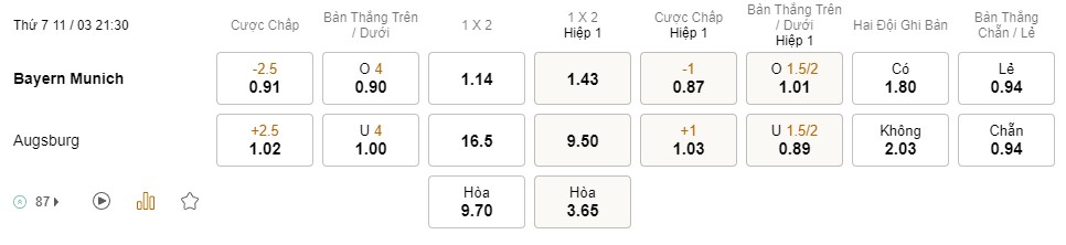 Soi kèo hiệp 1 Bayern vs Augsburg: 0.87*1*1.03