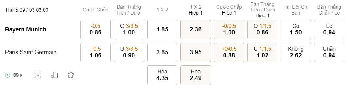 Soi kèo hiệp 1 Bayern vs PSG: 1.00*0/0.5*0.88