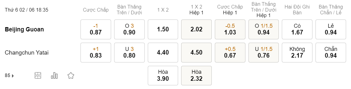 Tỉ lệ kèo Beijing Guoan vs Changchun
