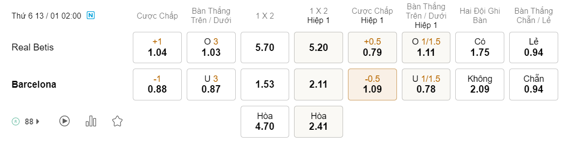 Soi kèo hiệp 1 Betis vs Barcelona: 0.79*0.5*1.09