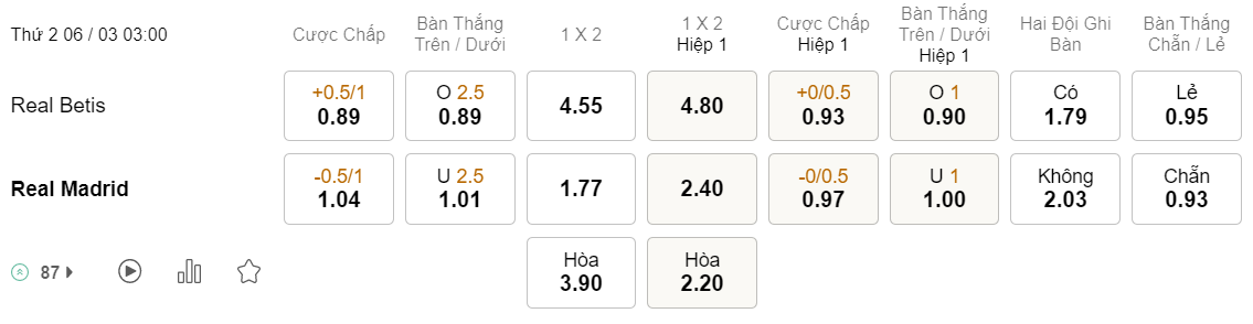 Tỉ lệ kèo Betis vs Real Madrid
