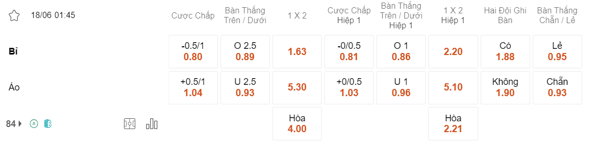 Soi kèo hiệp 1 Bỉ vs Áo: 0.81*0/0.5*1.03
