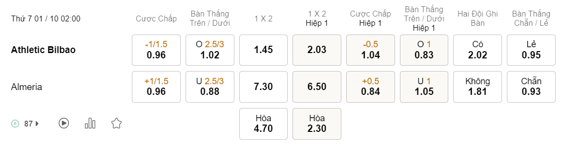 Tỉ lệ kèo Bilbao vs Almeria
