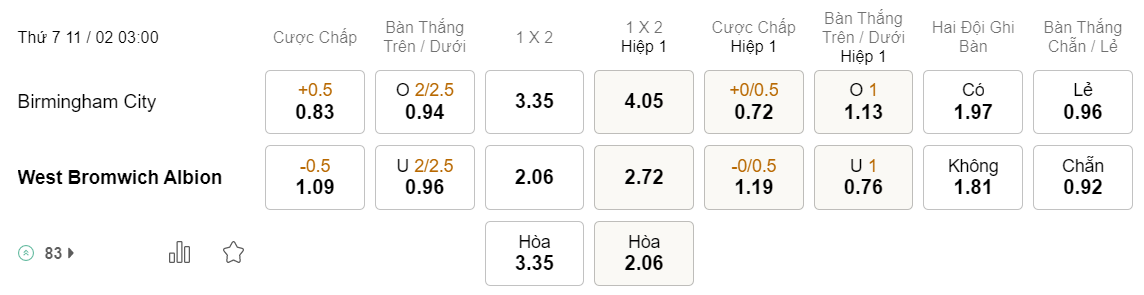 Soi kèo hiệp 1 Birmingham vs West Brom: 0.72*0/0.5*1.19