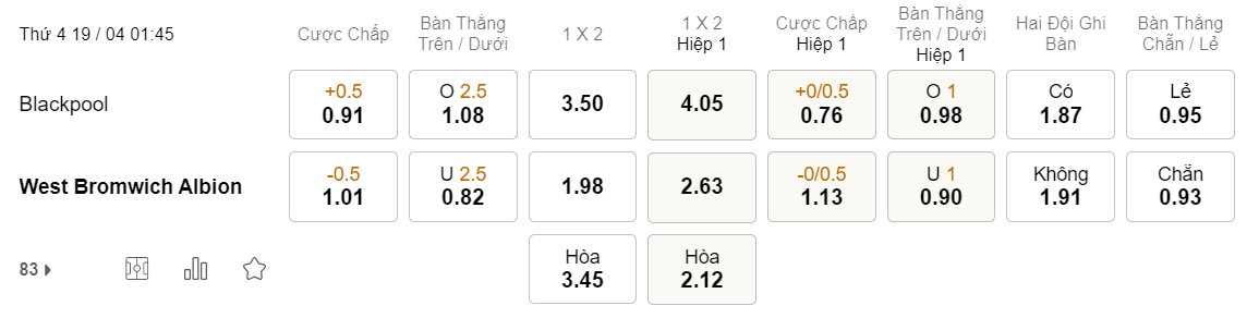 Soi kèo hiệp 1 Blackpool vs West Brom: 0.76*0/0.5*1.13