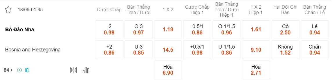 Tỉ lệ kèo Bồ Đào Nha vs Bosnia