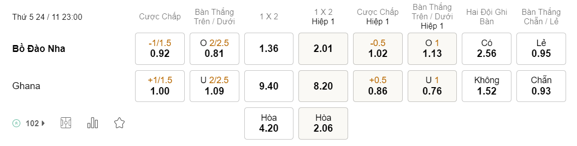 Tỉ lệ kèo Bồ Đào Nha vs Ghana
