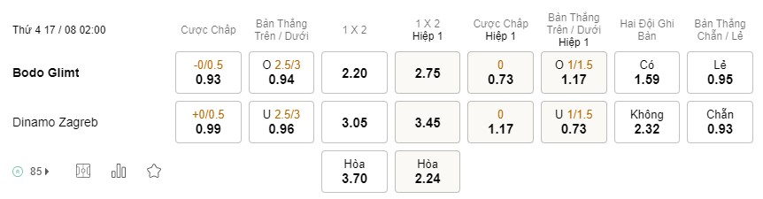 Soi kèo hiệp 1 Bodo Glimt vs Dinamo Zagreb: 0.73*0*1.17