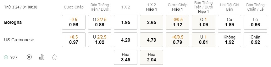 Soi kèo hiệp 1 Bologna vs Cremonese: 1.12*0/0.5*0.79
