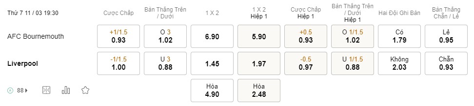 Soi kèo hiệp 1 Bournemouth vs Liverpool: 0.93*0.5*0.97