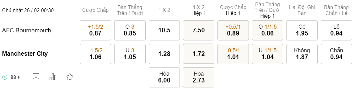 Soi kèo châu Á Bournemouth vs Man City: 0.87*1.5/2*1.06