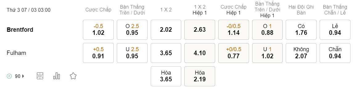 Soi kèo châu Á Brentford vs Fulham: 1.02*0.5*0.91