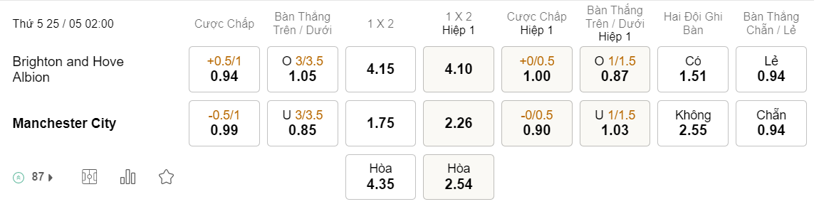 Lịch sử đã chỉ rõ sự chênh lệch về trình độ giữa 2 đội khi Man City là những người đã giành thắng lợi trong cả 3 lần gần nhất đối đầu Brighton và lần nào trong số đó The Citizen cũng ghi ít nhất 3 bàn vào lưới đối thủ. Vì vậy, các chuyên gia của Vebo TV nhận định tỉ lệ nổ Tài sẽ là khá cao.