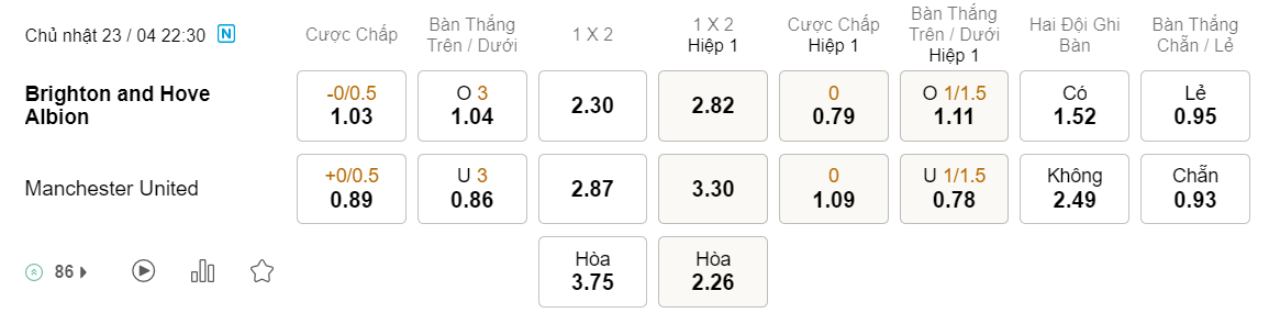 Soi kèo hiệp 1 Brighton vs MU: 0.79*0*1.09
