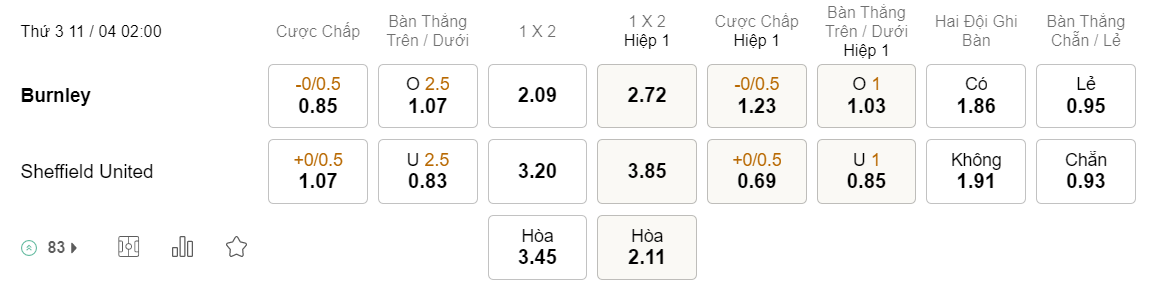 Soi kèo hiệp 1 Burnley vs Sheffield United: 1.23*0/0.5*0.69