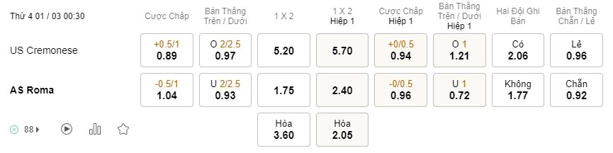 Soi kèo hiệp 1 Cremonese vs Roma: 0.94*0/0.5*0.96