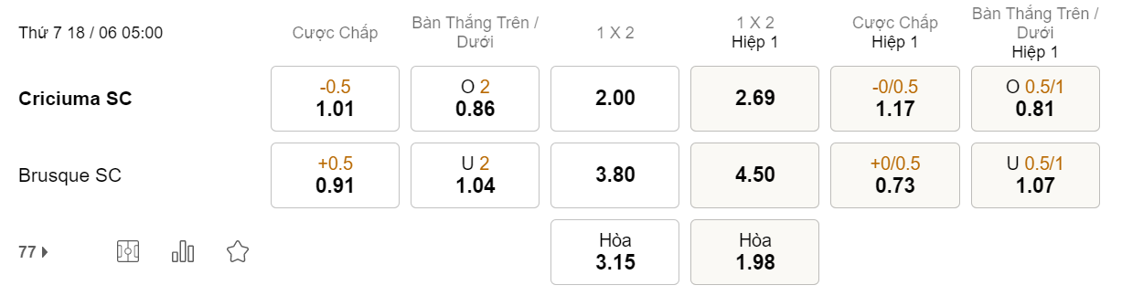 Soi kèo hiệp 1 Criciuma vs Brusque: 1.17*0/0.5*0.73