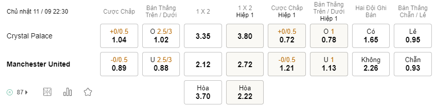 Soi kèo hiệp 1 Crystal Palace vs MU: 0.72*0/0.5*1.21