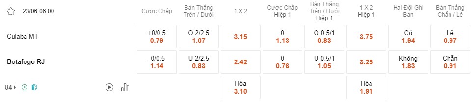 Soi kèo hiệp 1 Cuiaba vs Botafogo: 1.13*0*0.76