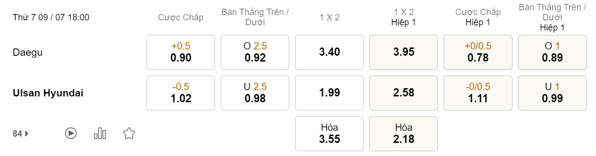 Soi kèo hiệp 1 Daegu vs Ulsan: 0.78*0/0.5*1.11