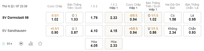 Tỉ lệ kèo Darmstadt vs Sandhausen