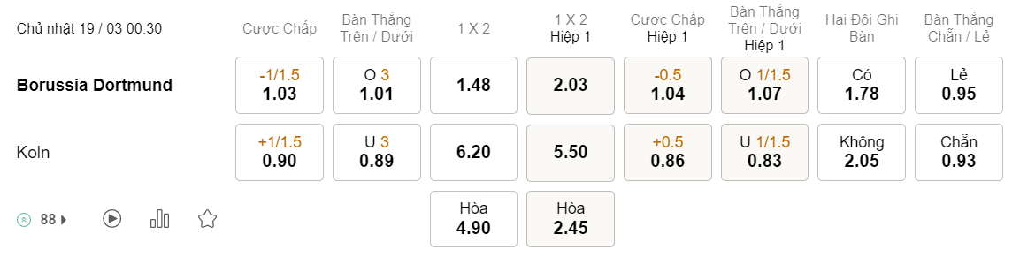 Soi kèo hiệp 1 Dortmund vs Cologne: 1.04*0.5*0.86