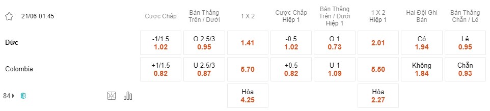 Soi kèo hiệp 1 Đức vs Colombia: 1.02*0.5*0.82