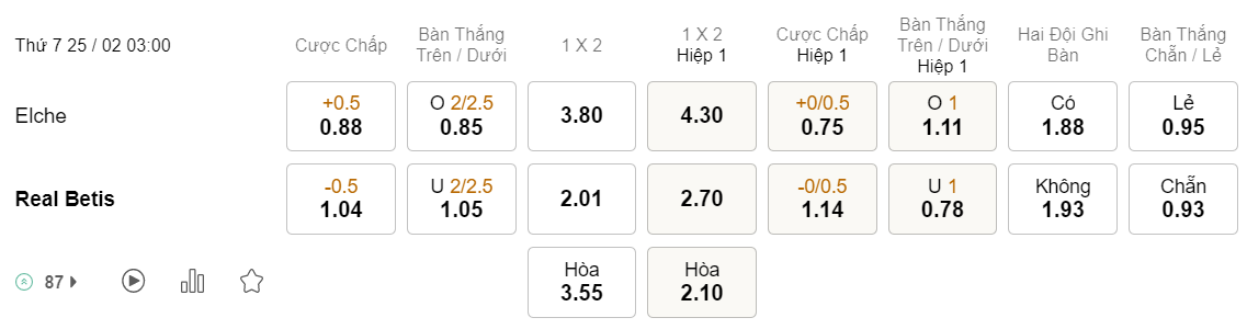 Soi kèo hiệp 1 Elche vs Betis: 0.75*0/0.5*1.14