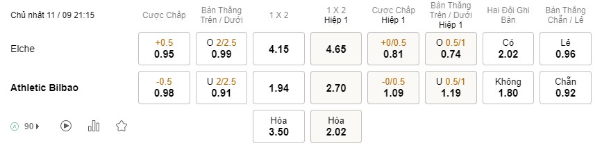 Soi kèo hiệp 1 Elche vs Bilbao: 0.81*0/0.5*1.09