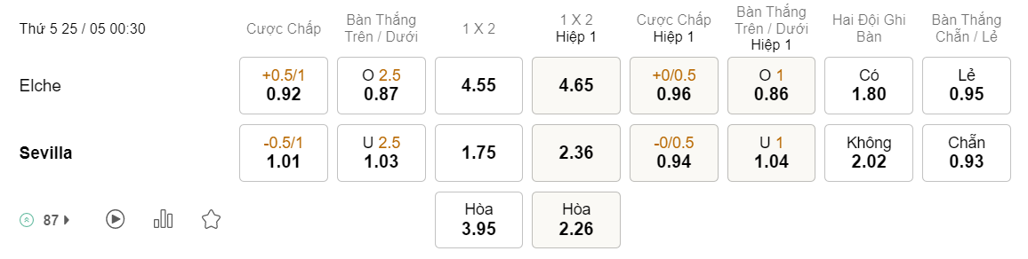 Soi kèo châu Á Elche vs Sevilla: 0.92*0.5/1*1.01
