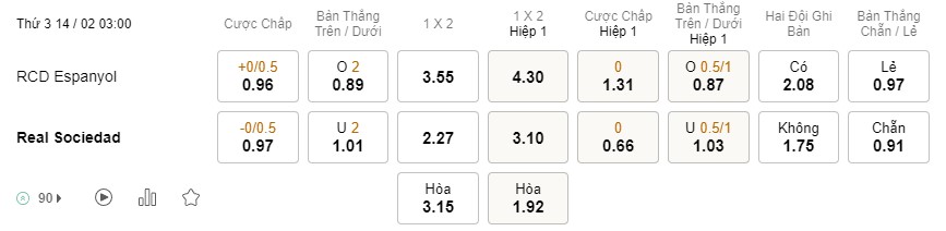 Soi kèo tài xỉu Espanyol vs Sociedad: 0.89*2*1.01