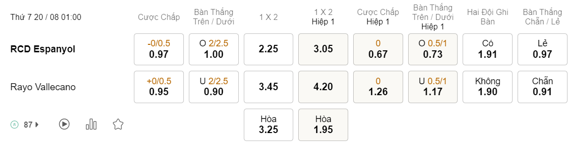 Soi kèo hiệp 1 Espanyol vs Vallecano: 0.67*0*1.26
