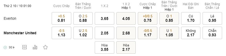 Soi kèo hiệp 1 Everton vs MU: 0.75*0/0.5*1.17