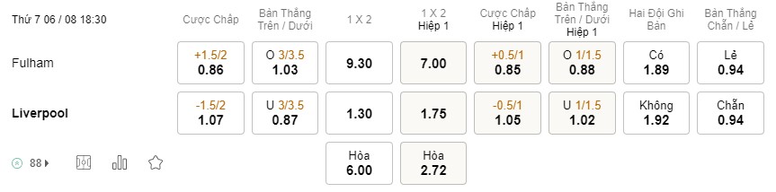 Soi kèo châu Á Fulham vs Liverpool: 0.86*1.5/2*1.07