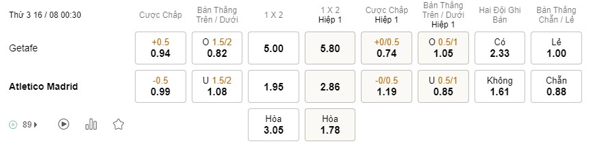 Soi kèo hiệp 1 Getafe vs Atletico Madrid: 0.74*0/0.5*1.19