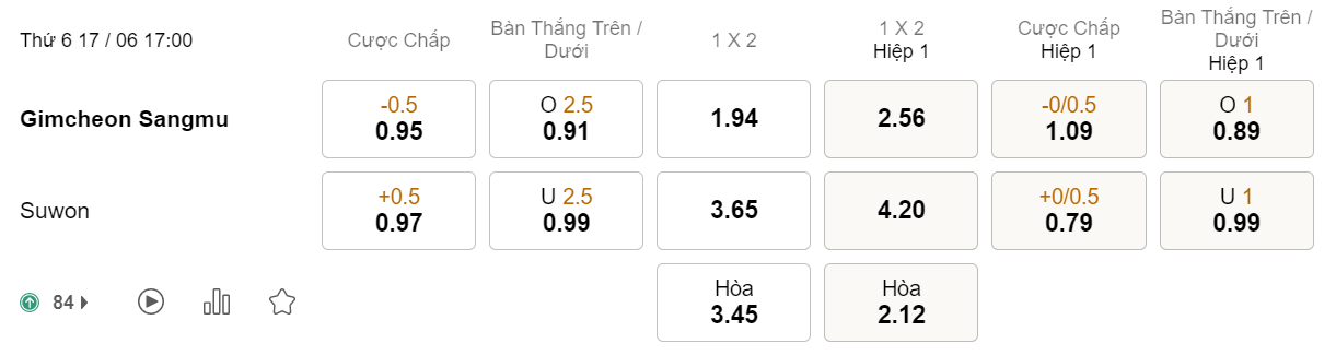Soi kèo hiệp 1 Gimcheon Sangmu vs Suwon: 1.09*0/0.5*0.79