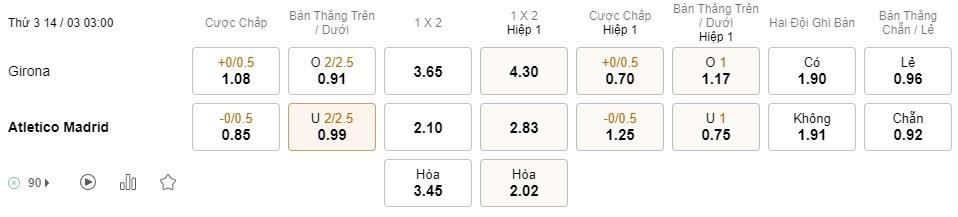 Soi kèo hiệp 1 Girona vs Atletico Madrid: 0.70*0/0.5*1.25