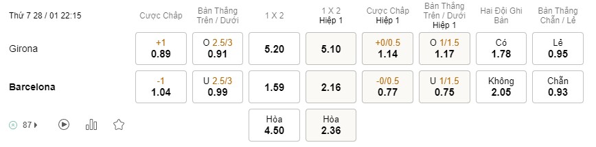 Soi kèo châu Á Girona vs Barcelona: 0.89*1*1.04
